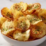 Crispy and flavorful Air Fryer Spicy Dill Pickle Chips made from thinly sliced russet potatoes marinated in pickle juice and seasoned with dill, garlic, and cayenne pepper. Perfect as a tangy snack or appetizer, these chips are air fried to golden perfection for a healthier crunchy treat.