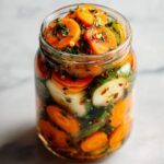 Remove the pan from heat and allow everything to cool slightly. Then transfer the vegetables and pickling liquid into clean glass jars, ensuring the carrots and other veggies stay submerged. Seal them up and pop the jars into the refrigerator for at least 24 hours so those flavors can truly develop their magic.