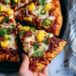 This BBQ Chicken Pizza combines smoky barbecue sauce, tender rotisserie chicken, tangy pineapple, and a blend of Monterey Jack and mozzarella cheeses on a crispy pizza crust. Optional toppings like red onion, jalapeño, bacon, and fresh cilantro add bursts of flavor and texture. Baked to perfection, this pizza is a perfect 30-minute meal to satisfy cravings with a delightful mix of savory, sweet, and spicy elements.