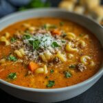 This hearty Beef & Tomato Macaroni Soup is a comforting one-pot meal combining browned ground beef, tender elbow macaroni, and a rich tomato-based broth seasoned with Italian herbs and smoked paprika. Perfect for a cozy family dinner, it’s easy to prepare and customizable with optional garnishes like fresh parsley and Parmesan cheese.