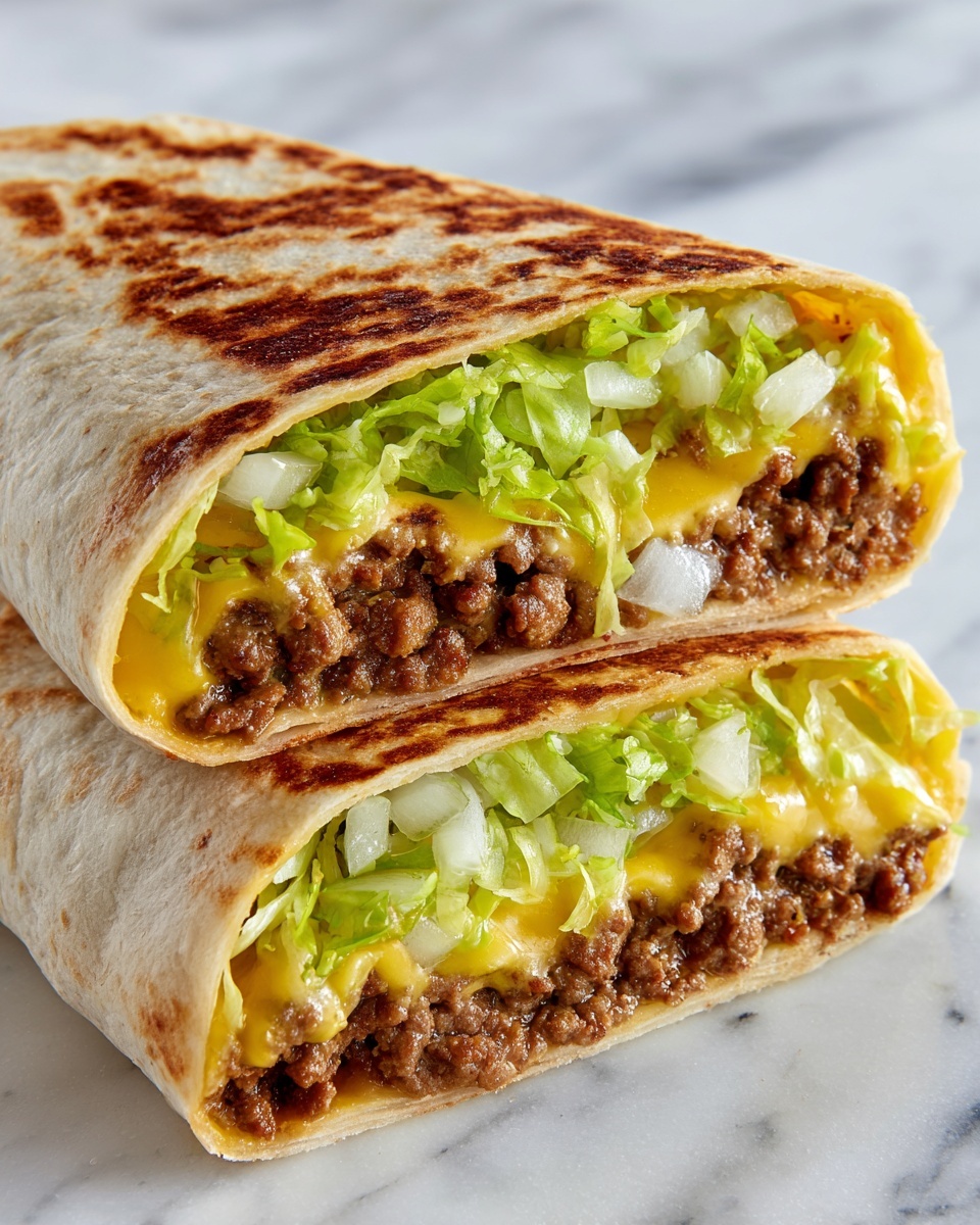 Lay each tortilla flat and evenly spread the beef mixture down the center. Top generously with shredded lettuce, cheddar cheese, and diced pickles. Layering these toppings last keeps everything crisp and fresh.