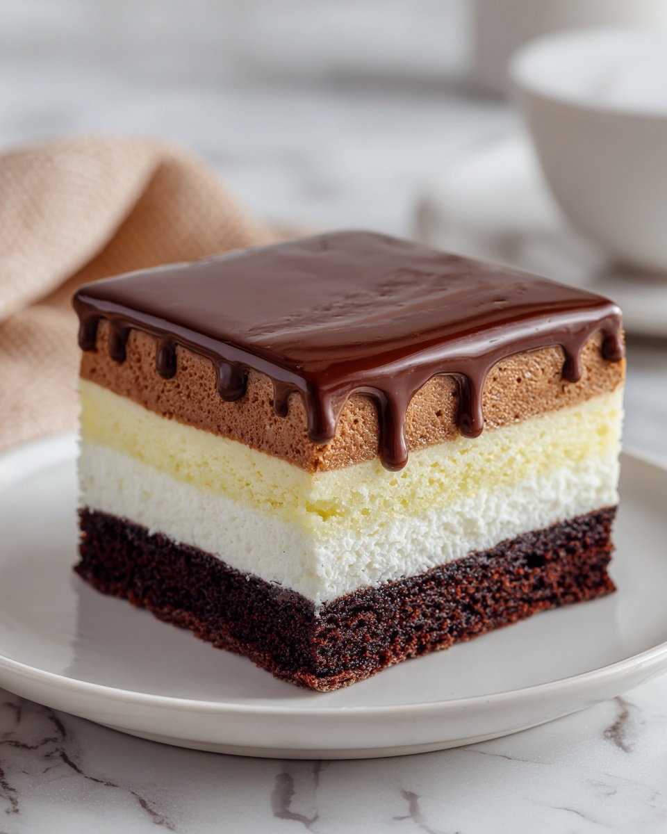 - Top the cake: Pour the chocolate ganache over the top of the cake, spreading it evenly to cover the custard layer.