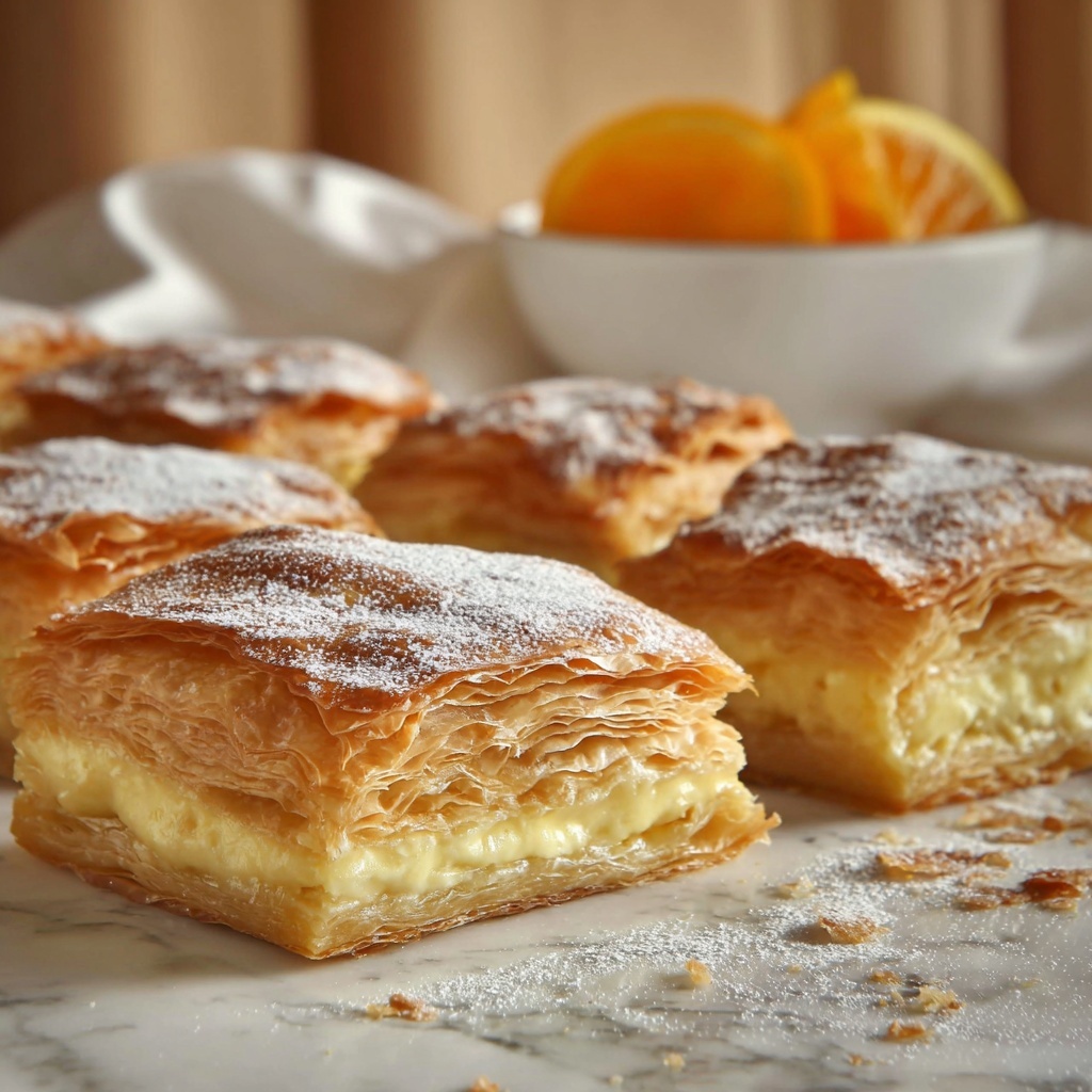 For a festive presentation, serve each squared piece on individual plates with a tiny bowl of homemade fruit preserves or Greek honey on the side. You can also sprinkle toasted almonds or pistachios on top for an extra crunch and nutty aroma that amps up the indulgence. Bougatsa can become an elegant centerpiece if layered in a glass trifle dish with alternating custard and phyllo shards for a casual yet stunning display.