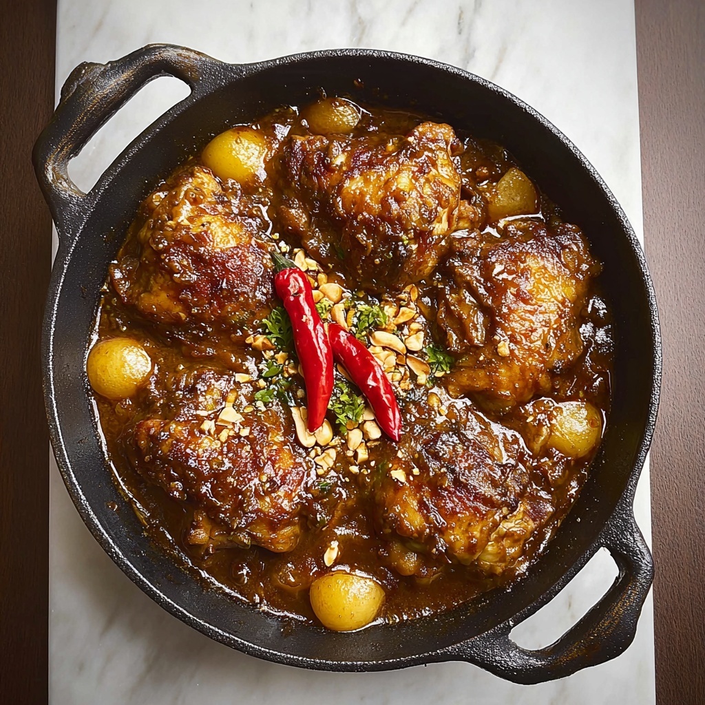This Braised Nutty Satay Chicken recipe features tender chicken thighs simmered in a rich, creamy peanut butter sauce infused with aromatic garlic, ginger, and coconut milk. Enhanced with soy, fish sauce, and a touch of chili paste, this Asian-inspired dish offers a perfect balance of sweet, salty, and spicy flavors. Garnished with chopped roasted peanuts and fresh cilantro, it’s a comforting main course ideal for serving over jasmine rice or noodles.
