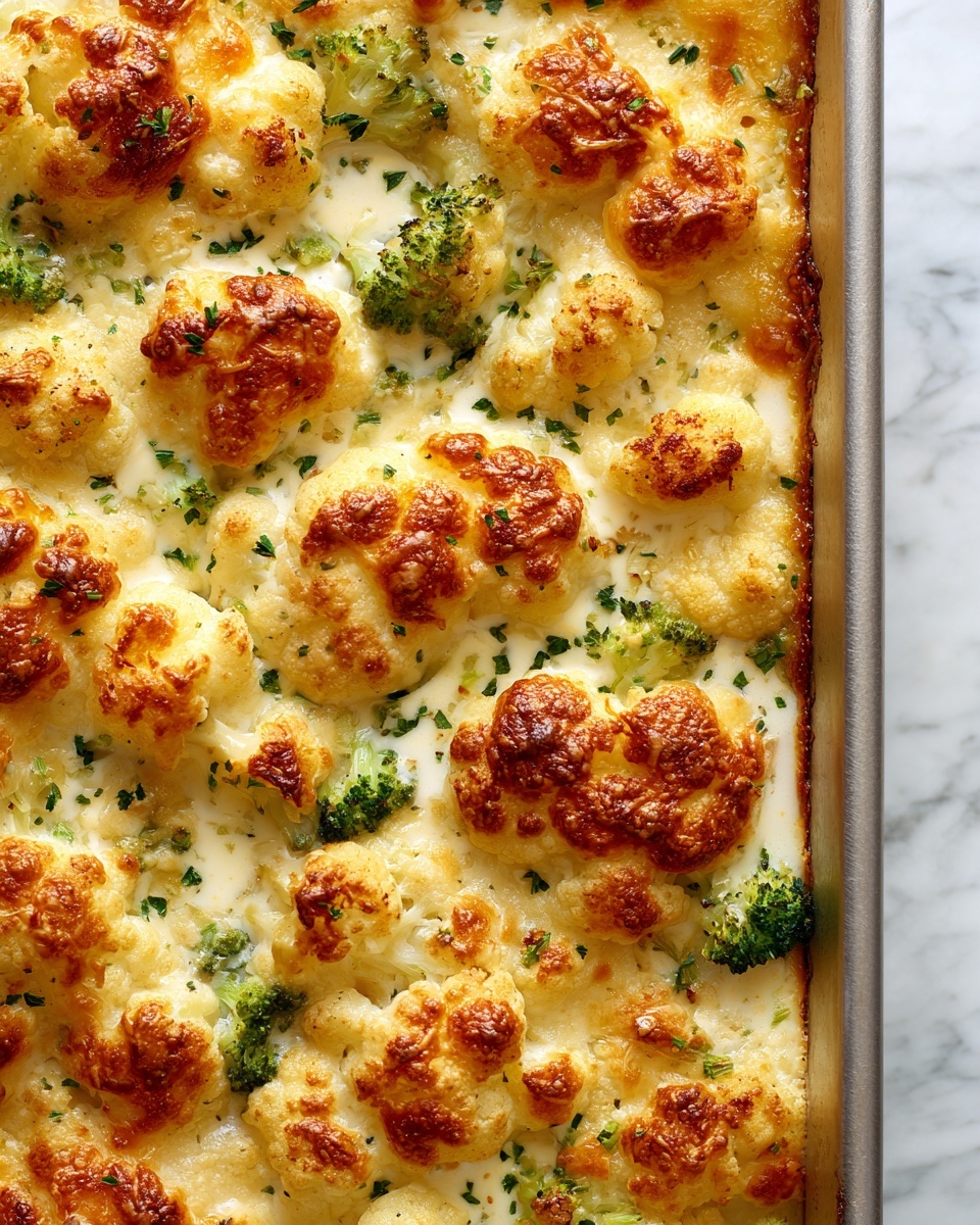 A creamy and cheesy cauliflower and broccoli gratin baked to golden perfection, combining tender florets in a rich cheddar-infused white sauce topped with crispy Parmesan breadcrumbs. Perfect as a comforting vegetarian side dish for holiday meals or everyday dinners.