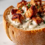Chicken Alfredo Garlic Bread Bowls combine crispy, buttery garlic bread bowls filled with creamy homemade chicken Alfredo sauce, making a comforting and hearty meal perfect for family dinners or special occasions.