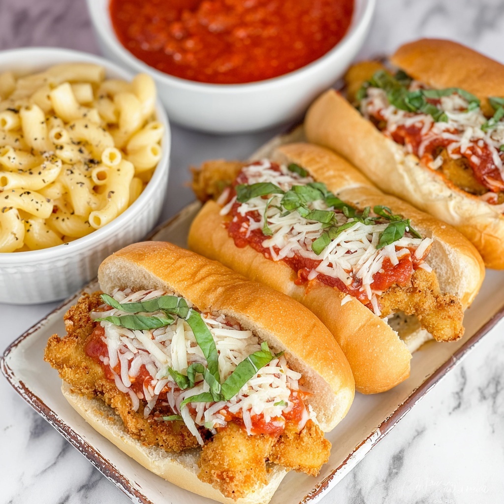 A quick and delicious twist on classic hot dogs, these Chicken Parmesan Bird Dogs combine crispy breaded chicken fingers with rich spaghetti sauce and melted cheeses, all nestled in buttery toasted buns and garnished with fresh basil for an easy, crowd-pleasing meal.