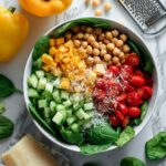 Start by rinsing and draining your canned chickpeas so they’re fresh and ready to absorb the bright flavors. Next, halve the cherry or grape tomatoes to release their juicy sweetness. Dice the yellow and orange bell peppers, making sure the pieces are bite-sized for easy eating. Slice the English cucumber thinly to keep a light, crisp texture throughout. Combine all of these colorful veggies and chickpeas in a large bowl, creating a vibrant foundation for your salad.