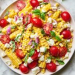 Sprinkle your Corn Salad Recipe with garnishes like crumbled feta cheese for a tangy, creamy addition or slices of ripe avocado for an indulgent, buttery texture. A handful of black beans can also add hearty substance and a nice contrast in both color and taste. Freshly cracked black pepper or an extra squeeze of lime just before serving can brighten the flavors even more.