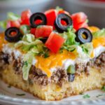 7. Cool, Slice, and Serve: Let the dish cool for a few minutes after baking to set. Slice into eight portions and serve warm, garnished with optional shredded lettuce, sliced olives, diced tomatoes, and taco sauce according to your preference.
