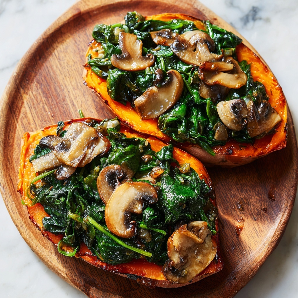 Once the sweet potatoes are out of the oven, let them cool slightly. Then carefully slice each potato down the middle lengthwise but not all the way through. Use a fork to mash and fluff the insides gently, creating a cozy little nest. Spoon generous amounts of the creamy mushroom and spinach mixture into each potato, letting some filling peek out to show off its richness. If you want, sprinkle fresh thyme or parsley on top for a fragrant, pretty finish.