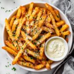 As soon as you pull the fries out of the oven, generously sprinkle grated Parmesan cheese and fresh chopped parsley over them while they’re still hot. This allows the cheese to slightly melt and create that savory, irresistible crust.