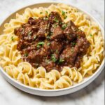 This Crockpot Beef Tips & Noodles recipe is a comforting and hearty dish featuring tender beef cooked low and slow with savory onion soup mix and creamy mushroom soup, served over perfectly cooked egg noodles. Easy to prepare and perfect for busy days, this slow-cooked meal delivers rich flavors and melt-in-your-mouth beef with minimal effort.