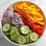 Slice the cucumbers into thin rounds or half-moons depending on your preference; this creates that refreshing crunch. Chop the sweet bell peppers into bite-sized chunks, allowing each colorful piece to complement the cucumbers with sweetness and a satisfying texture.