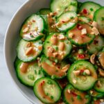 This refreshing Cucumbers in Spicy Peanut Sauce recipe combines crisp English cucumbers with a flavorful, creamy peanut sauce infused with soy, rice vinegar, honey, garlic, and chili flakes. Topped with toasted peanuts and fresh parsley, it makes a delightful, crunchy salad perfect as a light appetizer or side dish.