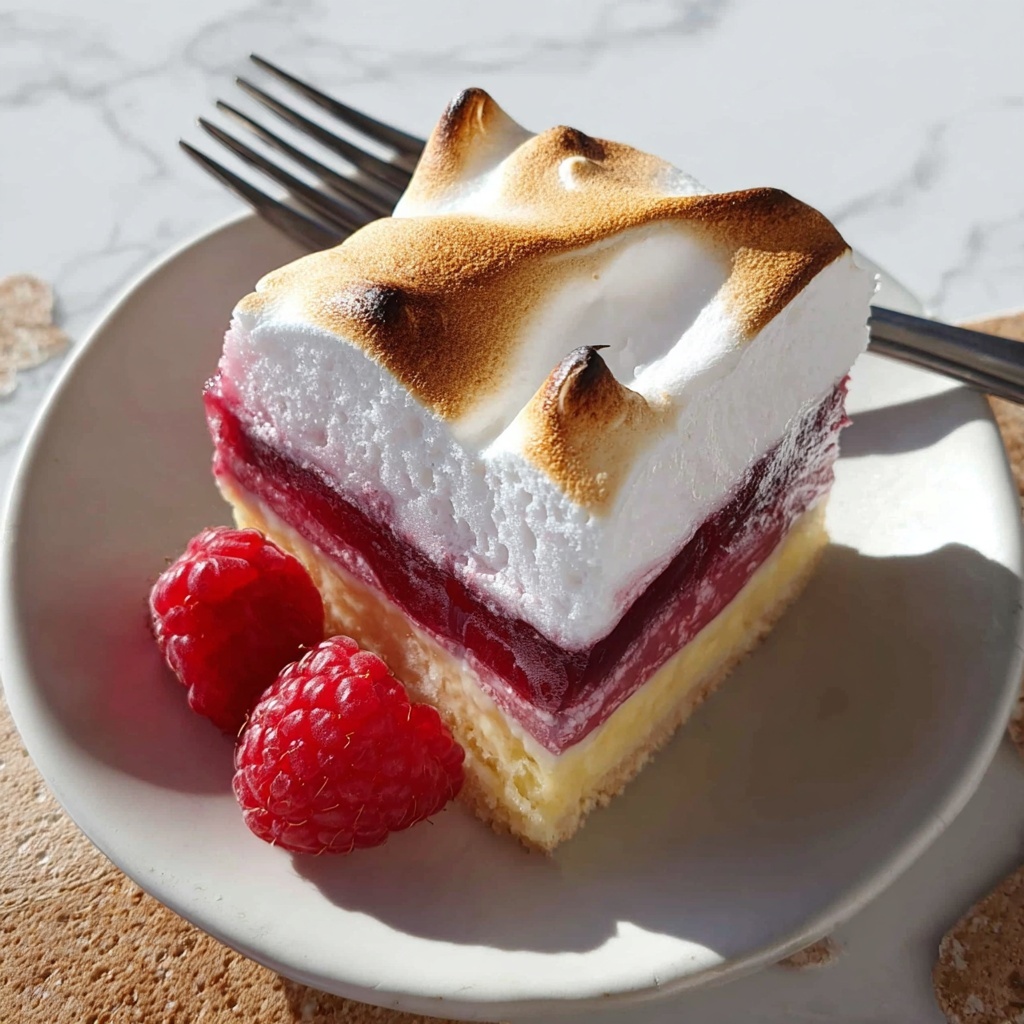 Gently spoon the meringue over the raspberry layer, spreading it carefully to the pan’s edges to seal everything inside, which prevents the filling from bubbling over. Bake the bars for another 20 to 25 minutes or until the meringue achieves a pale golden hue—this is when it’s just right for texture and taste. Once out of the oven, let the entire pan cool completely before slicing into bars to ensure clean and beautiful pieces.