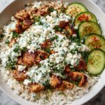 A sprinkle of crumbled feta cheese and fresh parsley or dill aren’t just pretty touches—they bring in bursts of salty tang and bright herbaceous freshness that contrast beautifully with the creamy tzatziki and tender chicken. Thin cucumber slices add a crisp, cool freshness that balances the warm, spiced bake perfectly.