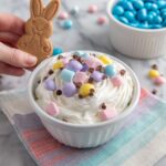 Carefully fold in the pastel M&M’s or mini chocolate eggs, plus most of the sprinkles. Reserve a few candies and sprinkles for garnish, which will make your dip look as festive as it tastes.