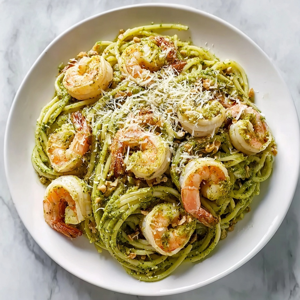 For a stunning presentation, serve the pasta in individual shallow bowls, twirling the noodles into neat nests to showcase the vibrant green pesto and shrimp perched on top. Adding a few whole pistachios or lemon wedges on the side adds a rustic charm and invites your guests to customize their experience.