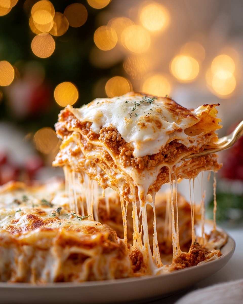 This Famous Three-Cheese Lasagna is a comforting Italian-American classic featuring layers of tender lasagna noodles, savory ground beef marinara, and a luscious blend of ricotta, mozzarella, and Parmesan cheeses. Perfectly baked until bubbly and golden, it makes an ideal family dinner or special occasion meal.