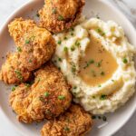 Crispy fried chicken breasts paired with creamy, buttery mashed potatoes make a classic, comforting meal that’s perfect for any day of the week. The chicken is marinated in a flavorful buttermilk and egg mixture, coated in a seasoned breadcrumb and flour blend, then fried to golden perfection. Served alongside smooth mashed potatoes enriched with whole milk and butter, this dish balances crunchy and creamy textures for a satisfying experience.