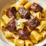 This Garlic Butter Steak Tips with Cheesy Rigatoni recipe combines tender, pan-seared steak pieces coated in rich garlic butter with creamy, cheesy rigatoni pasta. Ready in just 35 minutes, it’s a comforting and indulgent dish perfect for a satisfying dinner that brings together bold flavors and smooth textures in every bite.
