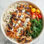 This Greek Chicken Bowls recipe features juicy marinated grilled chicken served over a bed of brown rice or cauliflower rice, topped with fresh cherry tomatoes, cucumber, red onion, Kalamata olives, crumbled feta cheese, and a refreshing homemade tzatziki sauce. Perfect for a healthy Mediterranean-inspired meal that’s great for meal prep and packed with vibrant flavors.