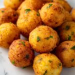 Using a tablespoon scoop, shape the mixture into small balls. This size ensures quick frying and ideal bite-sized portions. Lay them evenly on a parchment-lined baking sheet and pop them into the freezer for 30 to 45 minutes. This chilling step firms them up, making coating and frying a breeze.
