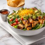 While the beef is cooling down, chop your romaine lettuce into bite-sized pieces for a satisfying crunch. Halve the juicy cherry tomatoes, thinly slice the red onion, and slice the black olives. Toss in shredded cheddar cheese to add a creamy, melty touch. Don’t forget the diced avocado, which adds a luscious, buttery texture that makes every forkful more indulgent.