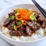 This Korean Beef Bowl recipe is a quick and flavorful dish featuring thinly sliced sirloin marinated in a savory mixture of soy sauce, garlic, ginger, and brown sugar, then sautéed to perfection and served over warm cooked rice. Garnished with green onions and sesame seeds, it’s an easy weeknight meal with authentic Korean-inspired flavors that can be ready in just 30 minutes.