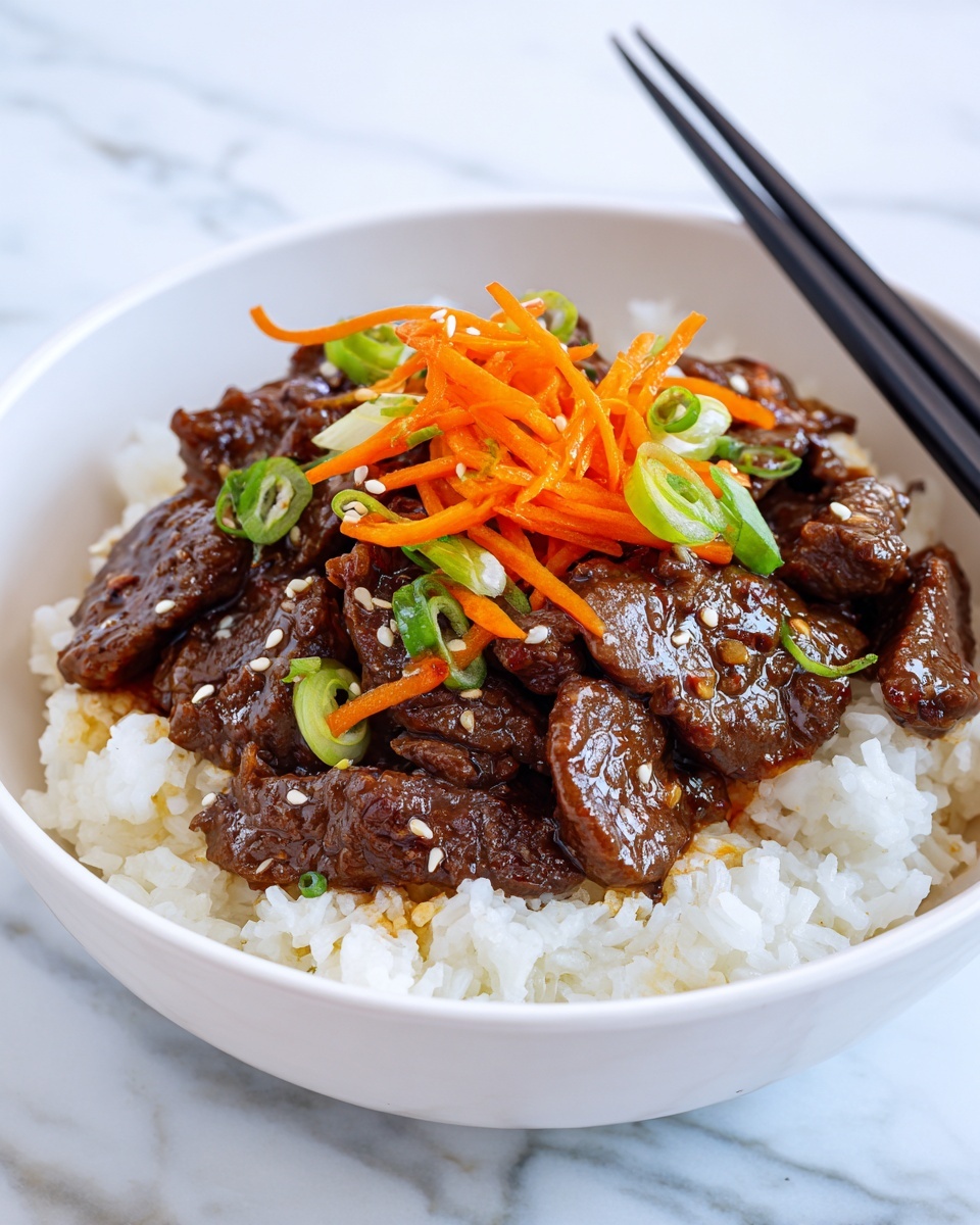 Fresh sliced green onions sprinkled on top add a burst of color and a gentle sharpness that contrasts beautifully with the sweet and savory beef. A sprinkle of toasted sesame seeds introduces a delightful crunch and an extra hint of nuttiness that elevates the entire dish.