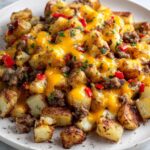 This Loaded Breakfast Hash is a hearty and satisfying dish featuring crispy golden hash browns combined with savory ground pork sausage, diced ham, sautéed onions, and red bell peppers, all topped with melted cheddar cheese. Perfect for a crowd-pleasing breakfast or brunch, this recipe offers a flavorful blend of textures and rich flavors in just about 35 minutes.
