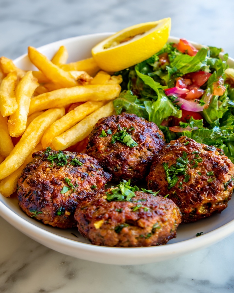 Meatballs, Crispy Fries, and Fresh Salad Recipe