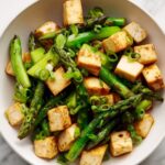 6. Serve and Garnish: Serve the miso-chile asparagus and tofu hot, garnished with toasted sesame seeds and sliced green onions if desired. Enjoy it on its own or over rice or noodles for a complete meal.