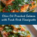 This Olive Oil Poached Salmon with Herb Vinaigrette Recipe pairs wonderfully with a variety of sides. Consider serving it alongside roasted seasonal vegetables like asparagus or baby carrots, a light lemony rice pilaf, or a crisp green salad tossed in a simple vinaigrette for a well-rounded meal.