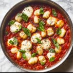 This One Pot Tomato Gnocchi with Spinach is a comforting and easy-to-make Italian-inspired dish that combines tender shelf-stable gnocchi simmered in a rich tomato sauce with fresh spinach and melted mozzarella cheese. Cooked entirely in one oven-safe skillet, this recipe simplifies dinner preparation while delivering layers of flavor with sautéed onions, garlic, and tomato paste, finished with a crisp, bubbly layer of mozzarella under the broiler.