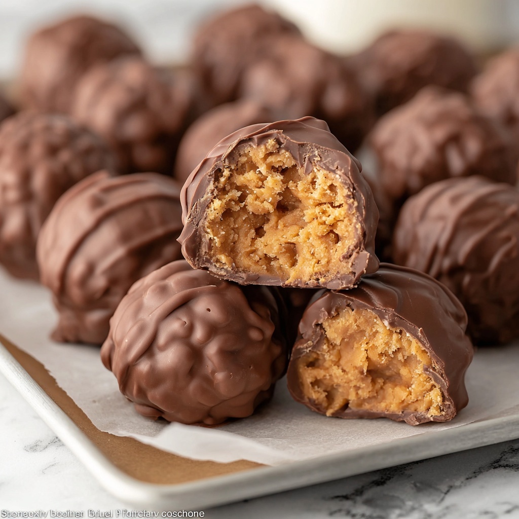 Delicious and easy-to-make Peanut Butter Balls with Rice Krispies coated in smooth semi-sweet chocolate. These no-bake treats combine creamy peanut butter, crispy cereal, and a rich chocolate shell, perfect for snacking or dessert.