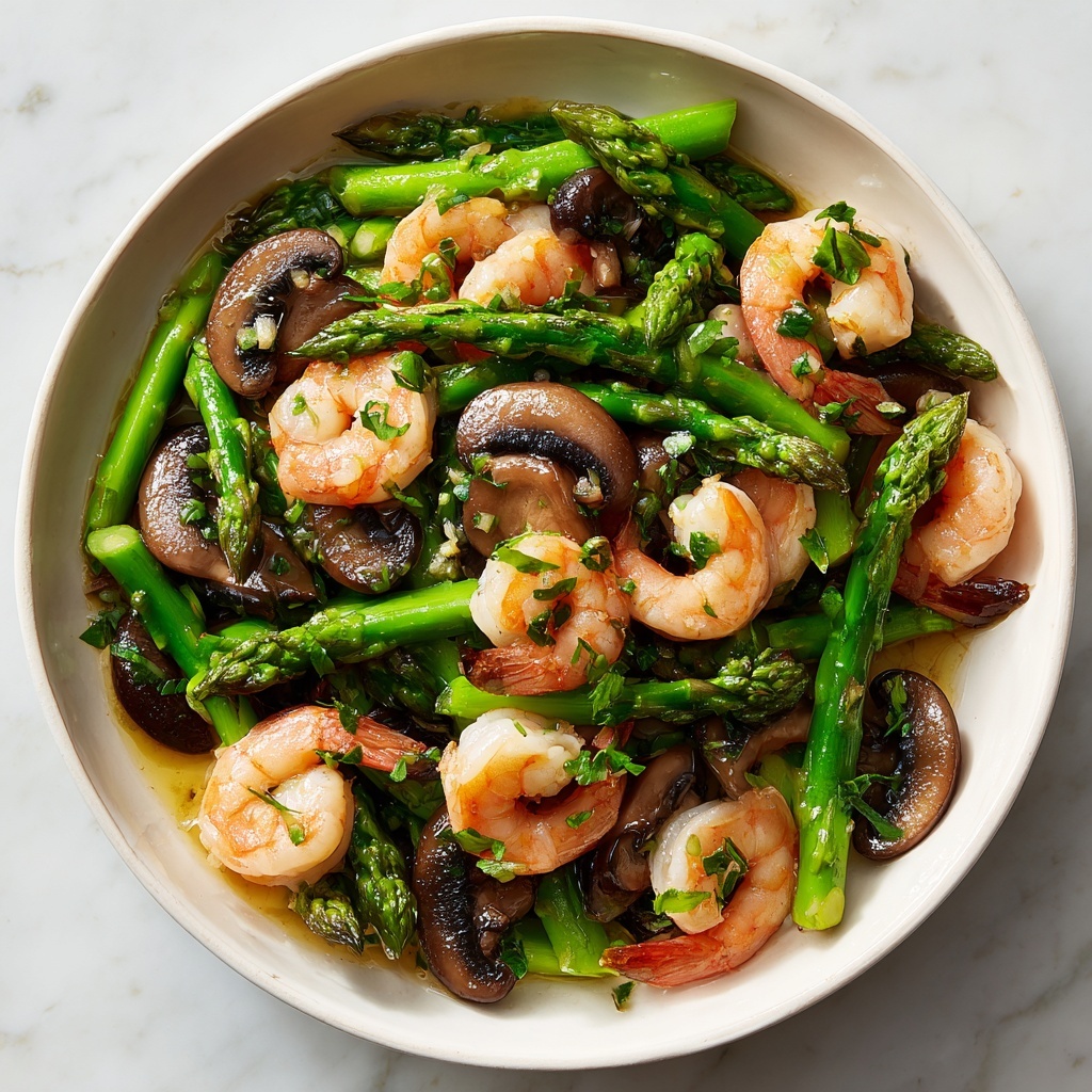 A quick and healthy Shrimp and Asparagus Stir-Fry with Mushrooms recipe that combines tender shrimp, crisp asparagus, and savory mushrooms in a flavorful garlic-ginger soy sauce. Perfect for a nutritious weeknight dinner, this stir-fry is ready in just 30 minutes and serves four.