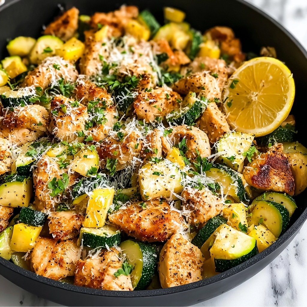 This Skillet Lemon Parmesan Chicken with Zucchini and Squash is a quick, flavorful one-pan meal perfect for busy weeknights. Tender diced chicken breasts are seasoned with Italian herbs and lemon zest, then cooked alongside fresh zucchini and yellow squash. Finished with a sprinkle of parmesan, fresh parsley, and a splash of lemon juice, this dish delivers a bright, savory, and comforting dinner in just 30 minutes.