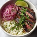 This Skirt Steak Rice Bowls with Chimichurri Sauce recipe offers a vibrant and flavorful meal featuring tender, seared skirt steak served over fluffy white rice and topped with a zesty cilantro chimichurri sauce. Perfect for a quick yet satisfying dinner, this dish combines the smoky richness of the steak with the fresh brightness of the chimichurri and optional toppings like pickled red onions and lime wedges for added zest.