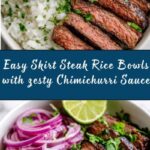 This Skirt Steak Rice Bowls with Chimichurri Sauce recipe offers a vibrant and flavorful meal featuring tender, seared skirt steak served over fluffy white rice and topped with a zesty cilantro chimichurri sauce. Perfect for a quick yet satisfying dinner, this dish combines the smoky richness of the steak with the fresh brightness of the chimichurri and optional toppings like pickled red onions and lime wedges for added zest.