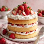While the strawberries are macerating, take a fresh bowl and whip the heavy cream along with powdered sugar and vanilla extract. Whip until you achieve soft peaks — not too stiff, so it folds nicely when layering. This airy whipped cream is what will bring that classic, dreamy feel to every bite of your Strawberry Angel Cake Recipe.