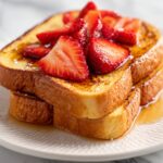 5. Serve: Plate the French toast and top with fresh sliced strawberries, a dollop of whipped cream, and drizzle with maple syrup or dust with powdered sugar for an extra touch of sweetness.