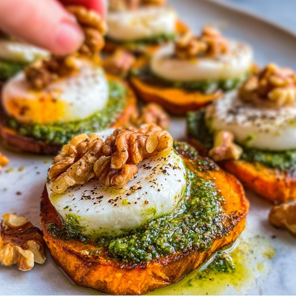- Assemble the stuffed sweet potatoes: Once roasted, split each sweet potato open lengthwise and gently fluff the insides with a fork. Spoon a generous amount of sage pesto over each sweet potato, then top with torn pieces of burrata and toasted walnuts.