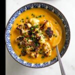 This Sweet Potato Soup with Roasted Cauliflower Crumbles is a creamy, nourishing dish that combines the natural sweetness of roasted sweet potatoes and onions with the nutty depth of ginger and macadamia nuts. Topped with crispy roasted cauliflower bits, fresh chives, and a bright squeeze of lemon, this soup offers a delightful contrast in textures and flavors. Perfect for cozy dinners or impressive entertaining, it’s a vegan, gluten-free recipe that’s both comforting and sophisticated.