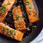 This Teriyaki Salmon recipe features tender, flaky salmon fillets marinated in a flavorful blend of teriyaki, hoisin, and soy sauces, then baked to perfection and topped with a glossy, thickened teriyaki glaze. Garnished with sesame seeds and green onions, it offers a delightful balance of sweet and savory Asian-inspired flavors, perfect for a quick and elegant dinner.