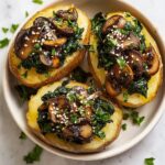 6. Assemble Stuffed Potatoes: Once the baked potatoes are done and cool enough to handle, slice them open lengthwise. Stuff each potato generously with the mushroom and spinach filling.