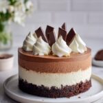 Follow the same procedure for the white chocolate mousse. Bloom gelatin, melt white chocolate with cream, mix in gelatin, fold in whipped cream, and spread over the milk chocolate layer. This final mousse layer makes the cake an irresistible concoction of creaminess and sweetness. After spreading, refrigerate the entire cake for at least four hours or overnight. This resting time helps the flavors meld and allows all the mousse layers to firm just perfectly.