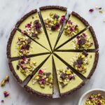 This Pistachio Tart is a decadent yet wholesome dessert featuring a crunchy buckwheat and oat crust infused with cacao, topped with a creamy pistachio filling made from soaked pistachios and coconut milk. Garnished with chopped pistachios, dark chocolate, and delicate rose petals, it is a no-bake tart that’s perfect for special occasions or anytime you crave a luscious treat with a nutty twist.